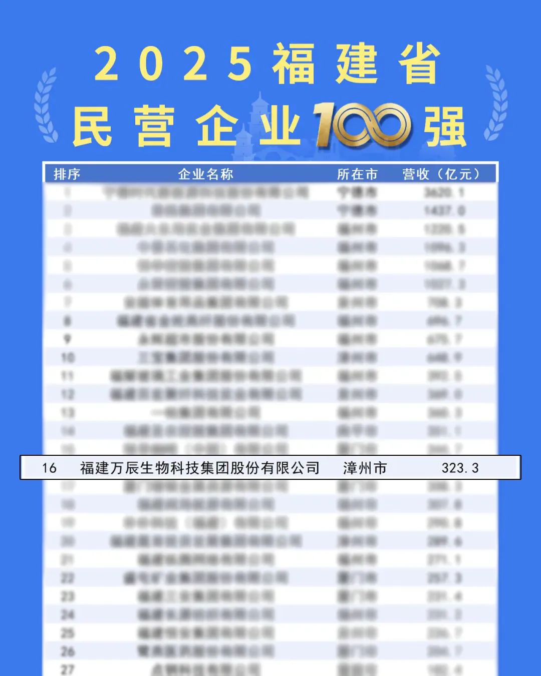 9月28日,2025福建省民營企業(yè)100強發(fā)布暨寧德市產(chǎn)業(yè)招商推介會在寧德舉行,會上福建省工商聯(lián)發(fā)布了2025福建省民營企業(yè)100強、制造業(yè)民營企業(yè)100強、服務(wù)業(yè)民營企業(yè)100強、創(chuàng)新型民營企業(yè)100強4個榜單。萬辰集團(tuán)登榜,位列2025福建民營企業(yè)100強第16位、2025福建服務(wù)業(yè)民營企業(yè)100強第4位。