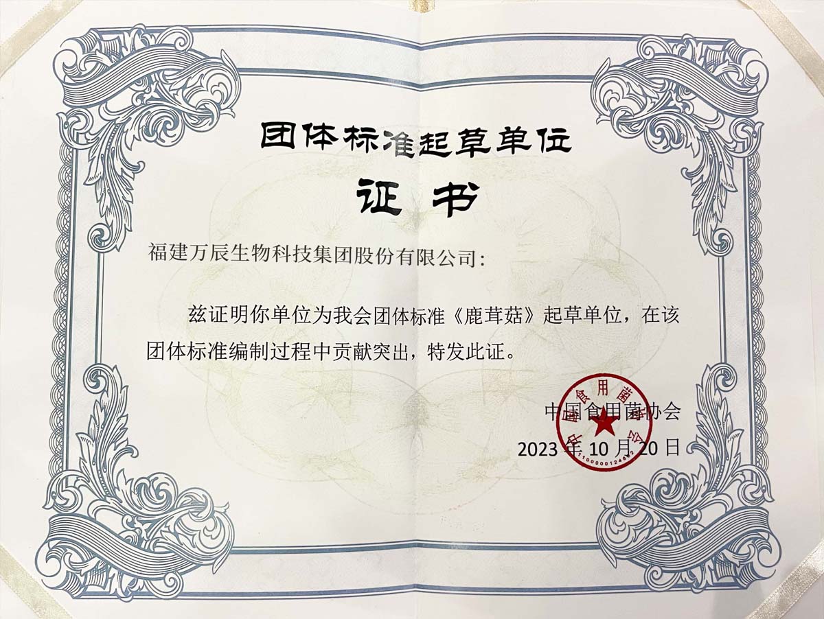 10月20日,萬辰集團(tuán)受邀參加第4屆中國食用菌產(chǎn)業(yè)博覽會,喜獲中國食用菌協(xié)會頒發(fā)的鹿茸菇團(tuán)體標(biāo)準(zhǔn)起草單位證書。